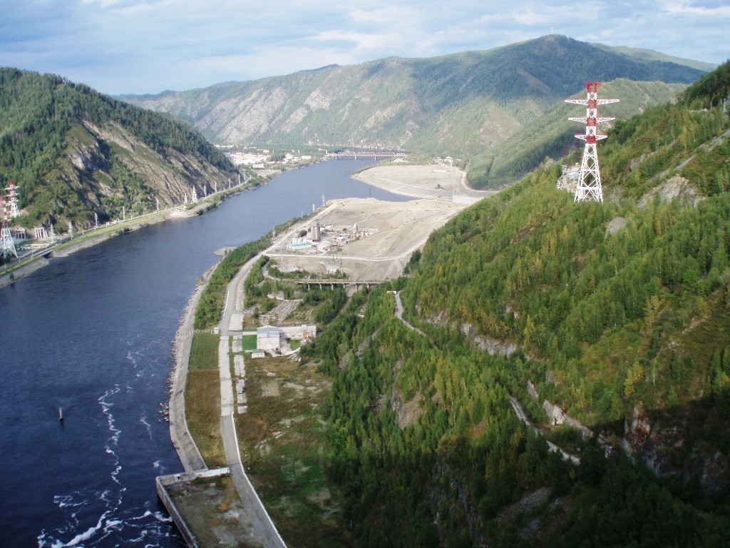 Саянские горы, Енисей, предзакатное солнце и величественная мощь сооружения ГЭС. Московскому гостю показали верхние и нижние бьефы — части реки, примыкающие к гидротехническому сооружению.