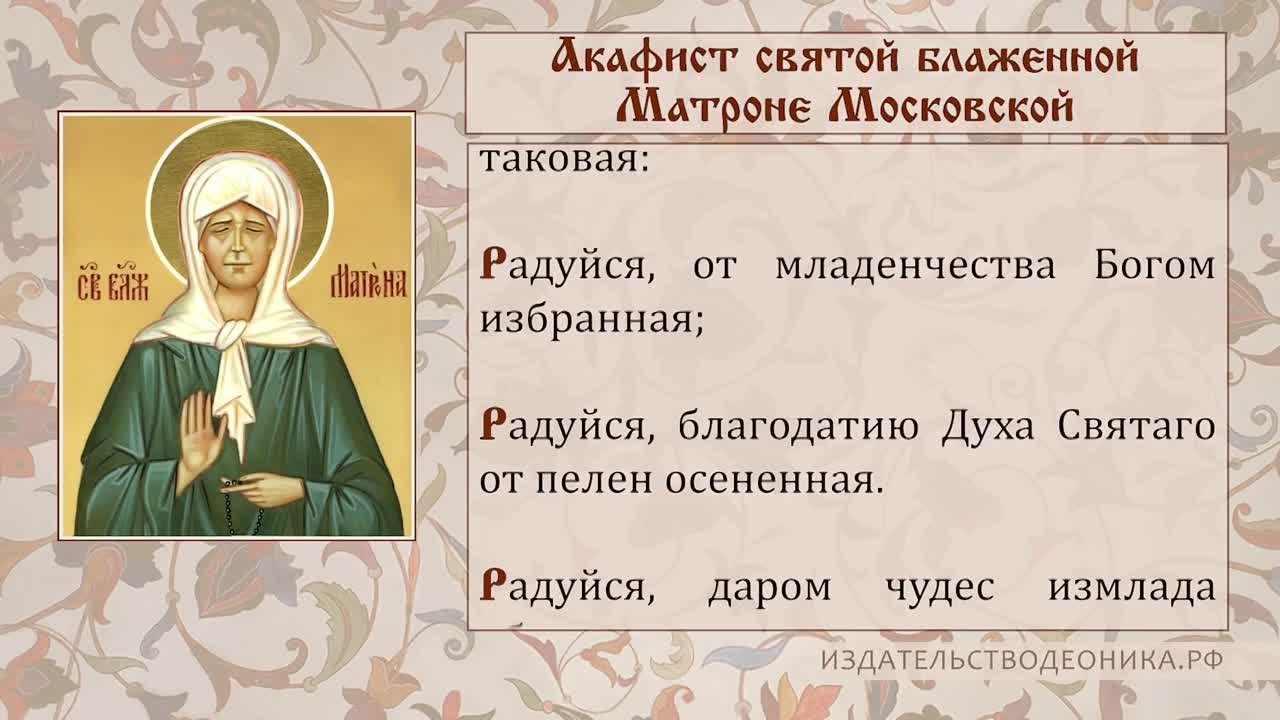 Избранной Богом от младенческих пелен и даром прозорливости, чудотворения и исцеления благодатию Духа Святаго одаренной, блаженной старице Матроне, нетленным венцем от Господа на Небеси увенчанной, соплетаем и мы, православнии, на земли венец похвальный из песней духовных, ты же, блаженная мати, приими сие от наших сердец благодарных, и яко имущая дерзновение пред Господем, от всяких нас бед, скорбей, болезней и козней вражиих избавиви, да с любовию поем ти: Радуйся, блаженная старице Матроно, предивная чудотворице.