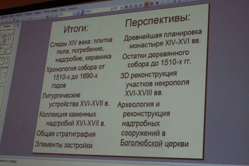 Леонид Андреевич показал интересную презентацию, рассказывающую об археологических работах, ведущихся на территории монастыря. Если осуществится совместная работа представителей Церкви и музейного дела, при поддержке научных исследований и технических возможностей, можно создать в монастыре высоко-технологичный музей, который отвечал бы всем международным требованиям высокого класса научной работы