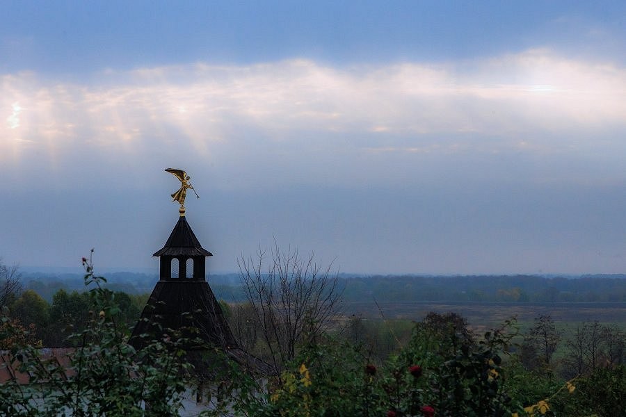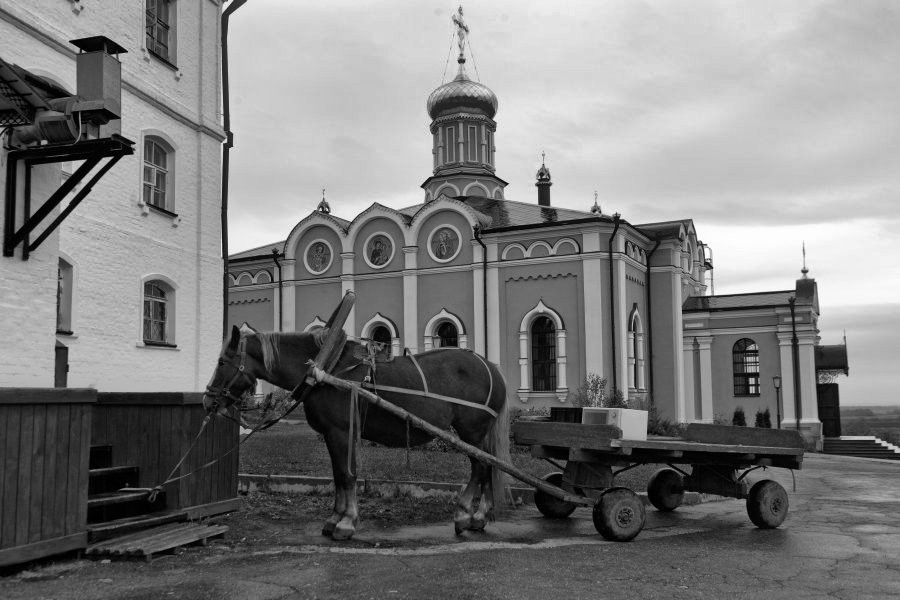 Вот, немногочисленная братия после утренней службы и трапезы неторопливо расходится по своим делам и заботам. В прохладном осеннем воздухе хорошо слышен вкусный запах свежеиспеченных просфор… У крыльца топчется гнедая лошаденка, ждет, когда сгрузят с телеги бидоны с молоком… На монастырском погосте под легким ветерком едва заметно колышутся запоздалые розы…