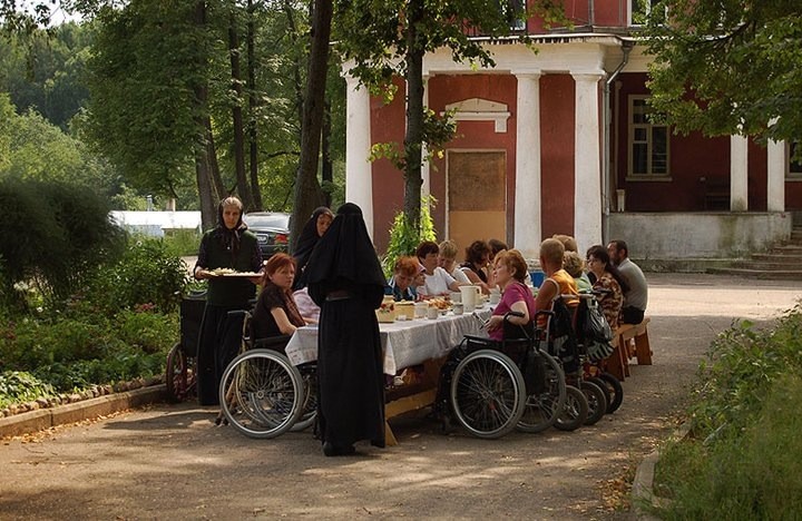 Многие из этих подопечных годами не выходят из дома — их некому спустить-поднять по лестнице. Насельницы монастыря привозят их в храм, вместе с ними служат молебен о здравии, потом исповедь, прогулка, обед на свежем воздухе и беседа с монахинями о духовной жизни. Многие потом звонят, пишут благодарности в письмах. А некоторые приезжают снова. Встречи с инвалидами регулярны.