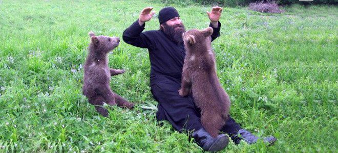 Грузинские монахи приручили бурых медведей. Медвежат не пугает присутствие людей, они с радостью играют с монахами .