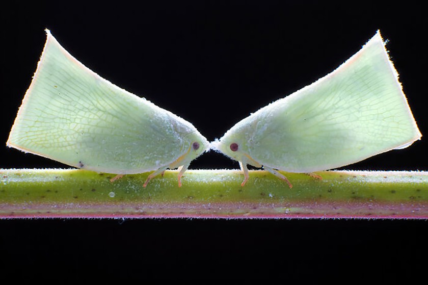 Две филлианы белые, стоящие на ветке лицом друг к другу. Фото: Chen-You Li