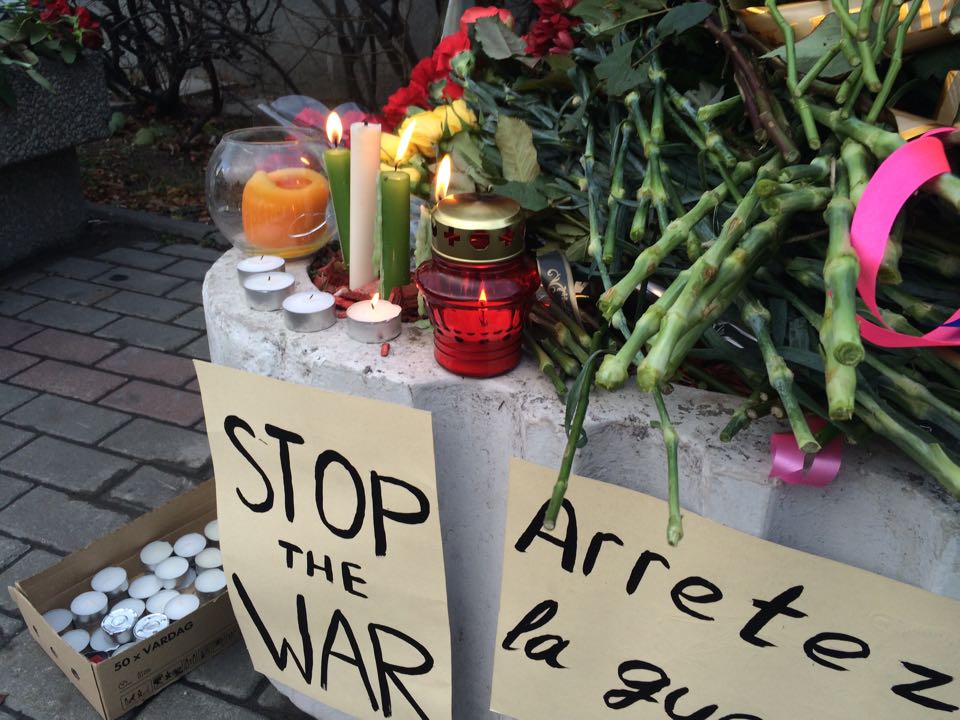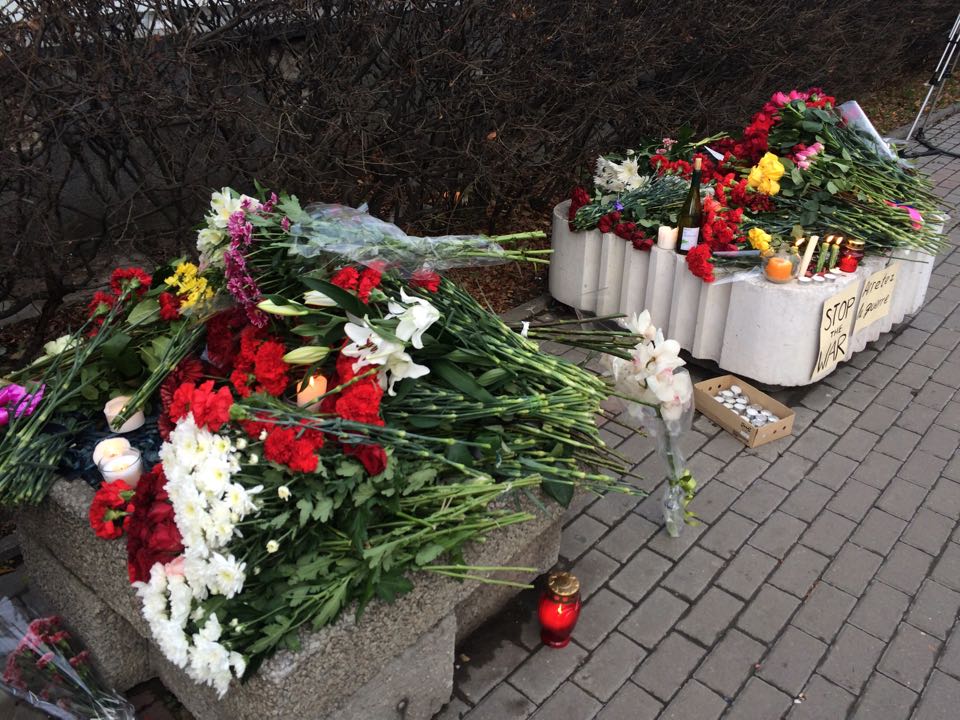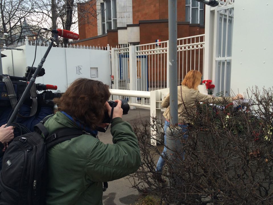 Москвичи несут цветы к французскому посольству в память о жертвах терактов