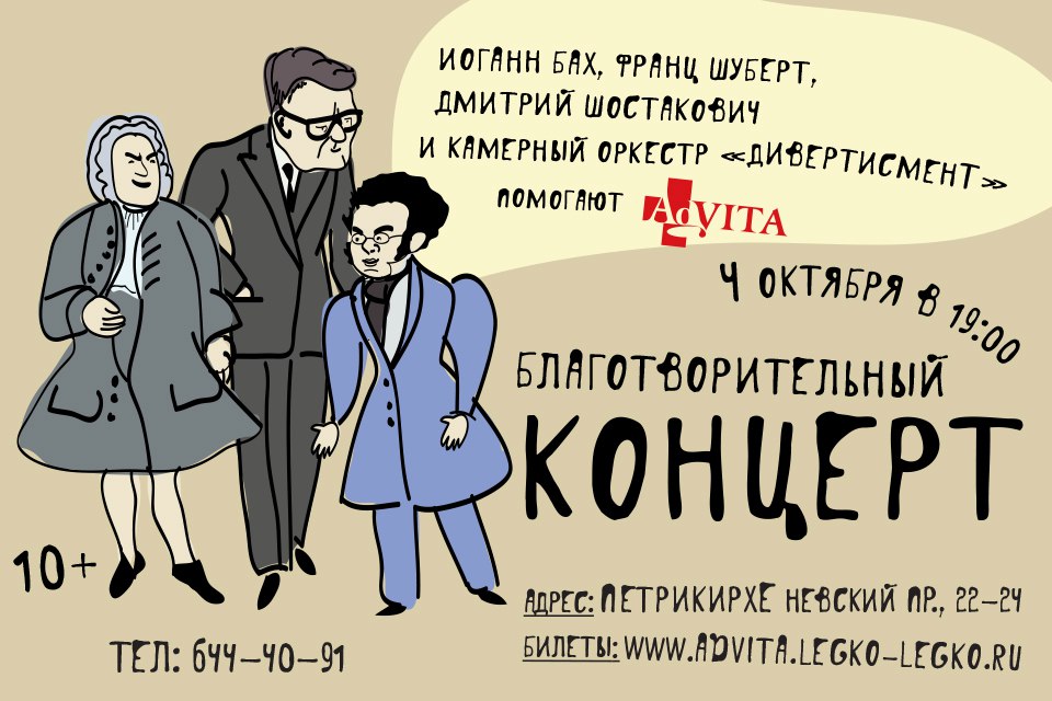 Каждый купленный билет на концерт – это помощь пожилому подопечному фонда AdVita. Если вы живете в другом городе и/или не можете пойти, но хотите поддержать пожилых подопечных фонда, купите билет и пришлите его на адрес pr@advita.ru, и он будет передан пожилым подопечным – фонда AdVita, блокадных сообществ и других организаций, опекающих пожилых.