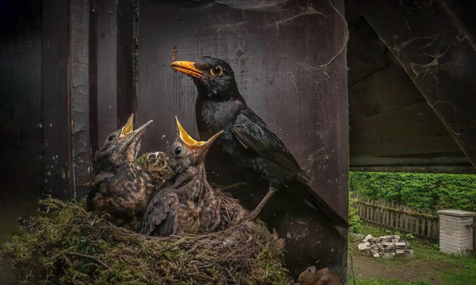 «Заботливый родитель», Игорь Микула. Евразийский черный дрозд кормит птенцов. Свое гнездо птицы свили на окне ванной комнаты друга фотографа. Снимок занял второе место в номинации «Фотоловушки».