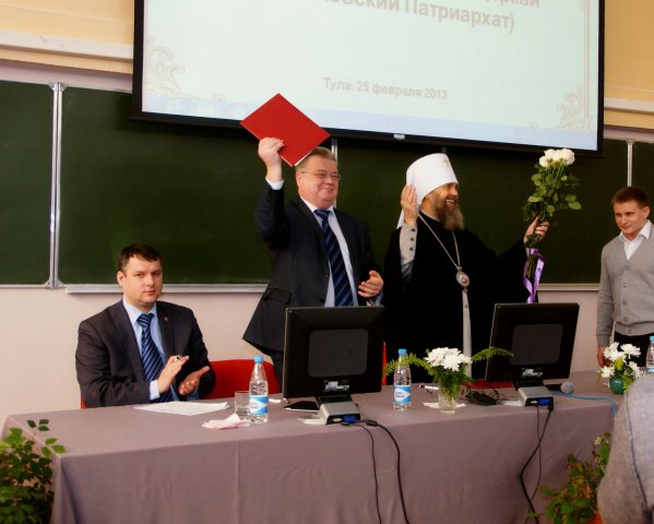 «Мы вместе шли к этому дню, можно сказать, с прошлого тысячелетия – именно тогда, в 1999 году началось дружеское сотрудничество епархии и университета. И наши отношения, постепенно восходя от силы в силу, привели нас к этому светлому и радостному дню подписания Соглашения о представлении в вузе интересной, серьезной, высокой и взвешенной программы подготовки будущих тульских педагогов и воспитателей нашего народа», — отметил в своем выступлении Митрополит Тульский и Ефремовский Алексий.