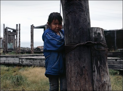 Мальчик и лайки. Поселок Лорино, Чукотка