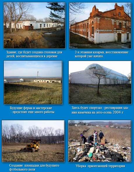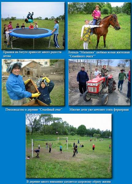 И чтобы были изменения у детей, необходимо много трудиться. Для этой цели в деревне открыты кружки и спортивные секции: шахматы, настольный теннис, конноспортивная школа, греко-римской борьба, тренажёрные залы, игровая (настольные игры), биллиардная, хоккей, футбол (есть все виды спорт площадок), изостудия, библиотека. Это не весь перечень того, что подготовлено для детей. К этому надо прибавить большое фермерское хозяйство («каждой твари по паре», почти ковчег из домашних животных и птиц), и достаточно большой огород — 50 гектаров для овощей. Но это для всей деревни, а не только для одной семьи. Важно чтобы в душе ребёнка не было пустоты, а то там посеются и произрастут сорняки, вырывать потом трудно и больно.