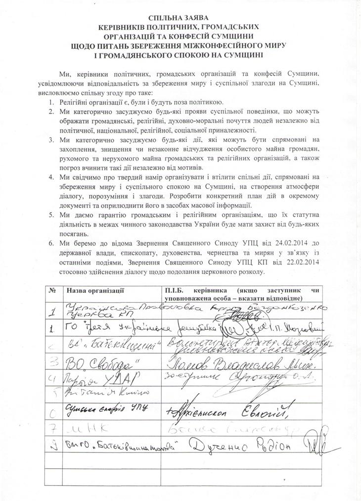 «Мы, руководители политических, общественных организация и конфессий Сумщины, осознавая ответственность за сохранение мира и общественного согласия на Сумщине, высказываем совместное согласие о следующем: