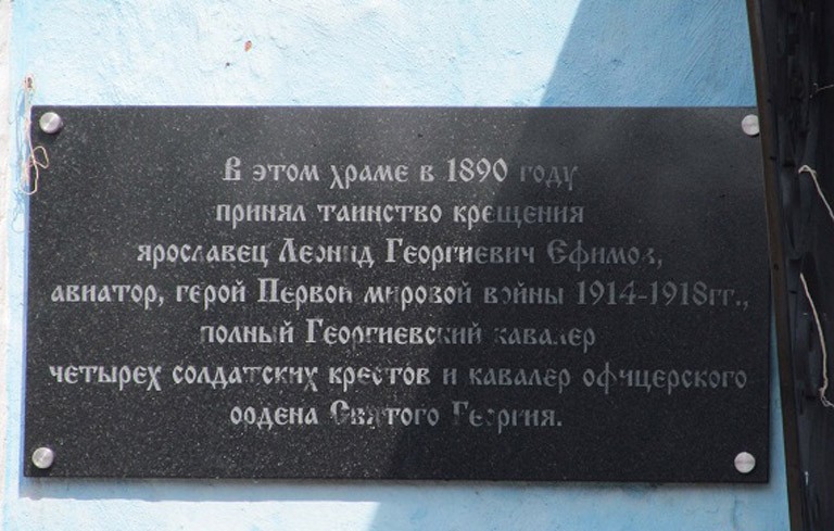 26 апреля. ПРАВМИР. На Петропавловском храме г. Ярославля, где в 1890 году был крещен будущий герой Первой мировой войны, кавалер трех Георгиевских крестов и ордена св. Георгия 4 ст. авиатор Леонид Ефимов, 19 апреля была установлена мемориальная доска. Об этом сообщается на сайте Ярославской митрополии.