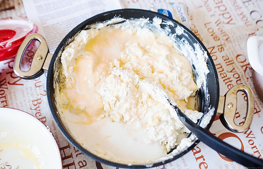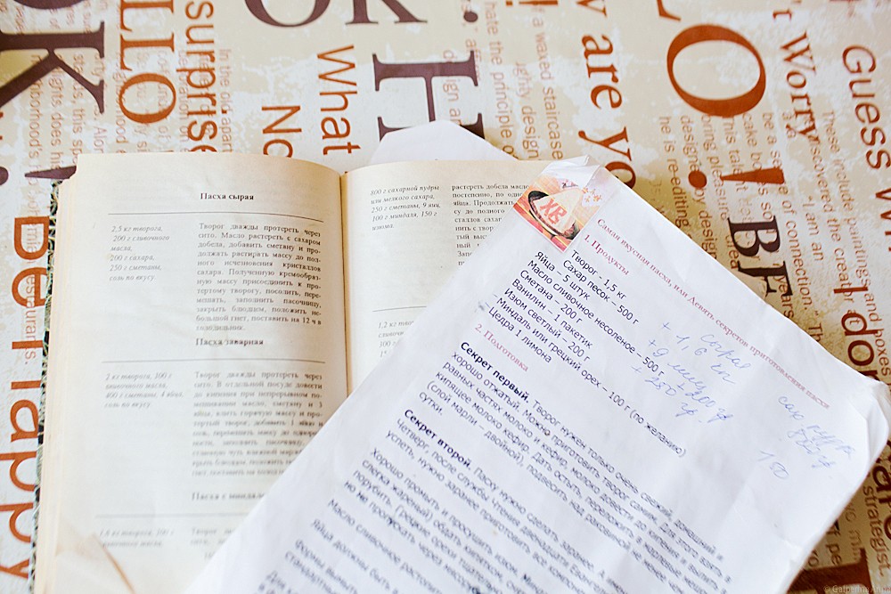 Готовили две пасхи – сырую и вареную. Делали все по «сокращенному» лайт-варианту: творог проворачивали через мясорубку вместе с изюмом вместо кропотливого протирания через сито, взбивали не венчиком и вручную, а специальной взбивалкой, проваривали пасху в двух кастрюлях. Мы всегда так делаем – нам не хватает времени и скрупулезности для того, чтобы готовить куличи и пасхи по 12-14 часов (как делают настоящие кулинарные монстры).