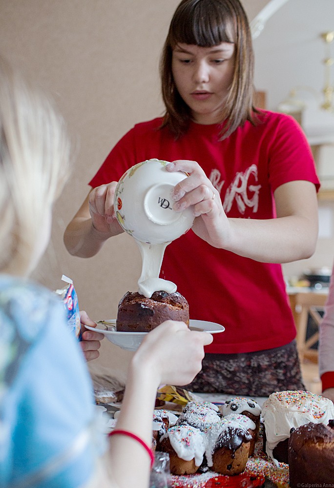 Еще забавнее было смотреть, как дети украшали куличи. Как-то в этом году оказалось, что в средствах для украшения снеди мы ограничены. Всего-то тюбики с помадкой, сахарная пудра, остатки посыпки. Дети, хохоча, рисовали на куличах смешные рожицы, облизывались, глядя на стекающую с куличей глазурь. И даже старшая Маша, почти уже не участвующая в делах семьи, нашла время, чтобы сделать свой рисунок на куличе.