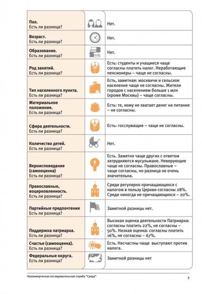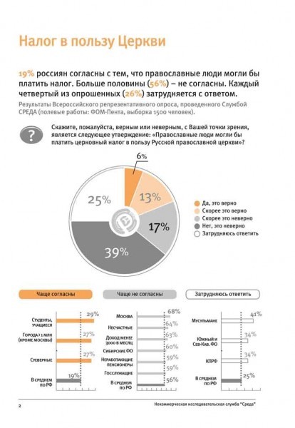 Мнения самих православных по отношению к налогу разделились. Чаще, чем в среднем по России, в пользу этого налога говорят регулярно причащающихся (28%). Те, кто не причащается никогда, согласны на это налог только в 20% случаев.