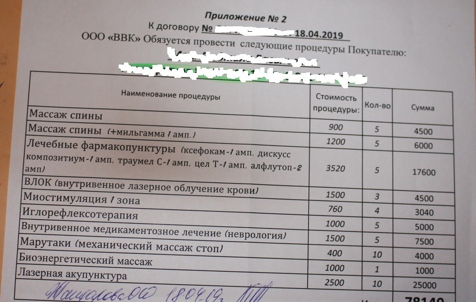 К утру следующего дня Валентина Иванова внимательно прочитала, что ей назначили – биоэнергетический массаж, лечебные фармакопунктуры, лазерную акупунктуру, механический массаж стоп, и пришла к выводу, что необходимости в таком лечении для нее нет. В медцентре по телефону подтвердили, что расторгнуть договор можно – надо вновь приехать в офис.