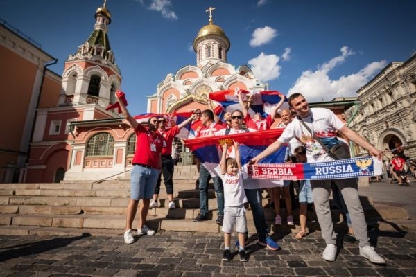 Перед собором Казанской иконы Божией Матери, что на углу Красной площади и Никольской улицы, растянули огромный флаг, поют и танцуют сербы. Среди кричалок своим и чужим явно слышится обращение с молитвой к Богу. В глубине Никольской, где стихийно развернулся фан-лагерь сербских болельщиков, непонятно на что забравшись, возвышается над толпой мужчина в национальной сербской одежде. Раззадоривая земляков, он также не забывает периодически креститься.