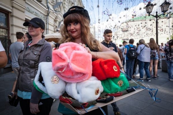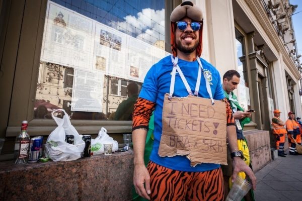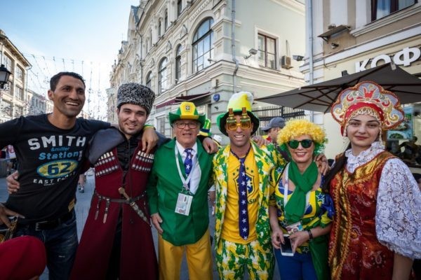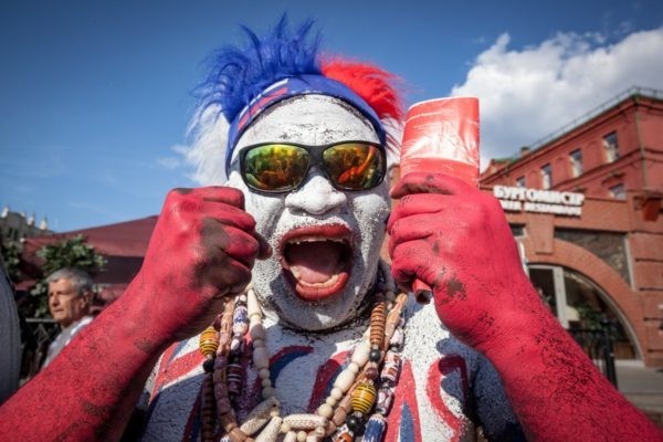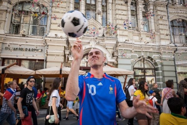 Многие на Никольской носят шапки в виде символа чемпионата, волчонка Забиваки, а чуть подальше, на площади Революции, стоит живой и народный символ – камерунец из подмосковных Люберец, большой человек Ригобер Еумби. Каждый день он надевает шаровары цвета российского триколора, раскрашивается в бело-сине-красный и выходит в город, чтобы веселить болельщиков и бесплатно сфотографироваться со всеми желающими. Ригобер мечтает, что сборная России выиграет этот чемпионат, и на всякий случай просит у всех, кто подходит к нему, билеты на любой матч. И если билет Ригобер пока не получил, то по крайней мере в народной любви купается.