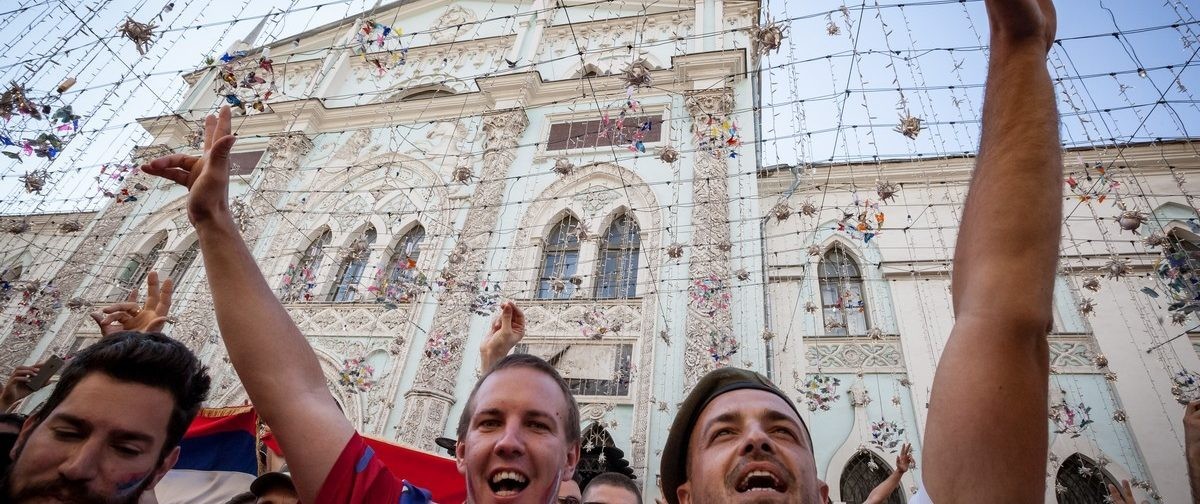 Со всех концов Никольской можно отчетливо слышать «Србия и Русия – братья заувек». Эти же слова написаны на некоторых флагах и сине-белых футболках, очень напоминающих российские. Вырываю из гудящей толпы подвыпившего сербского гостя и спрашиваю, почему Россия и Сербия – братья навек.
