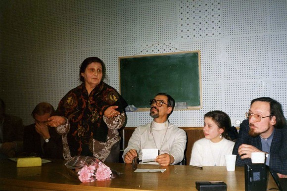 С о.Александром Борисовым, о. Владимиром Лапшиным, С.А.Коначевой, о. Георгием Чистяковым. Москва, Общедоступный православный университет, основанный о. Александром Менем, 1995
