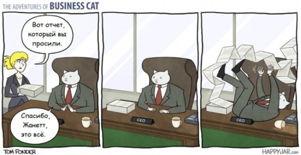 Кота-бизнесмена в 2014 году придумал британский художник Том Фондер. Его комиксы перевели в России.