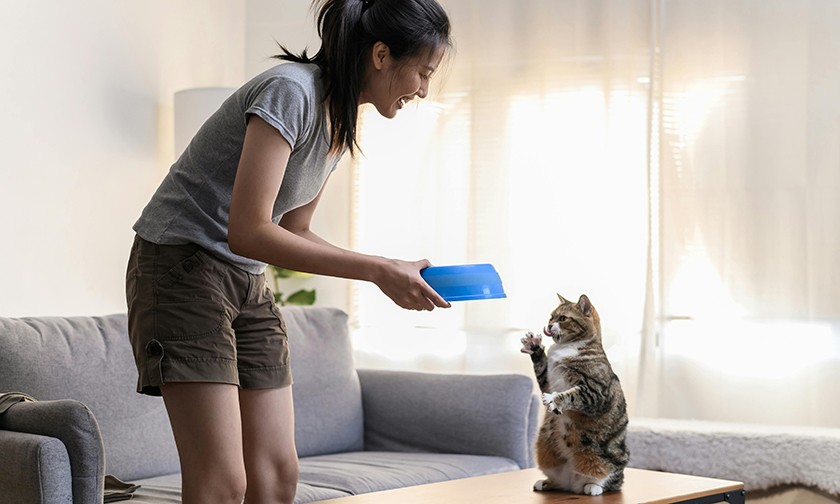 Жесты кот поймет, но сообразит ли он сам обратиться за подсказкой к человеку, если поставить перед ним невыполнимое задание, например предложить лакомство в контейнере, из которого сам он достать ничего не сможет? Чтобы выяснить это, экспериментаторы сначала приучили собак и кошек вытаскивать корм из закрытой миски, привязанной к табурету веревочкой. Лакомство клали в одну из трех мисок на глазах у животного. Затем зверя выпроваживали из комнаты и возвращали уже вместе с хозяином (когда еду клали в миску, хозяин не присутствовал). Кот или пес находили еду секунд за 25.