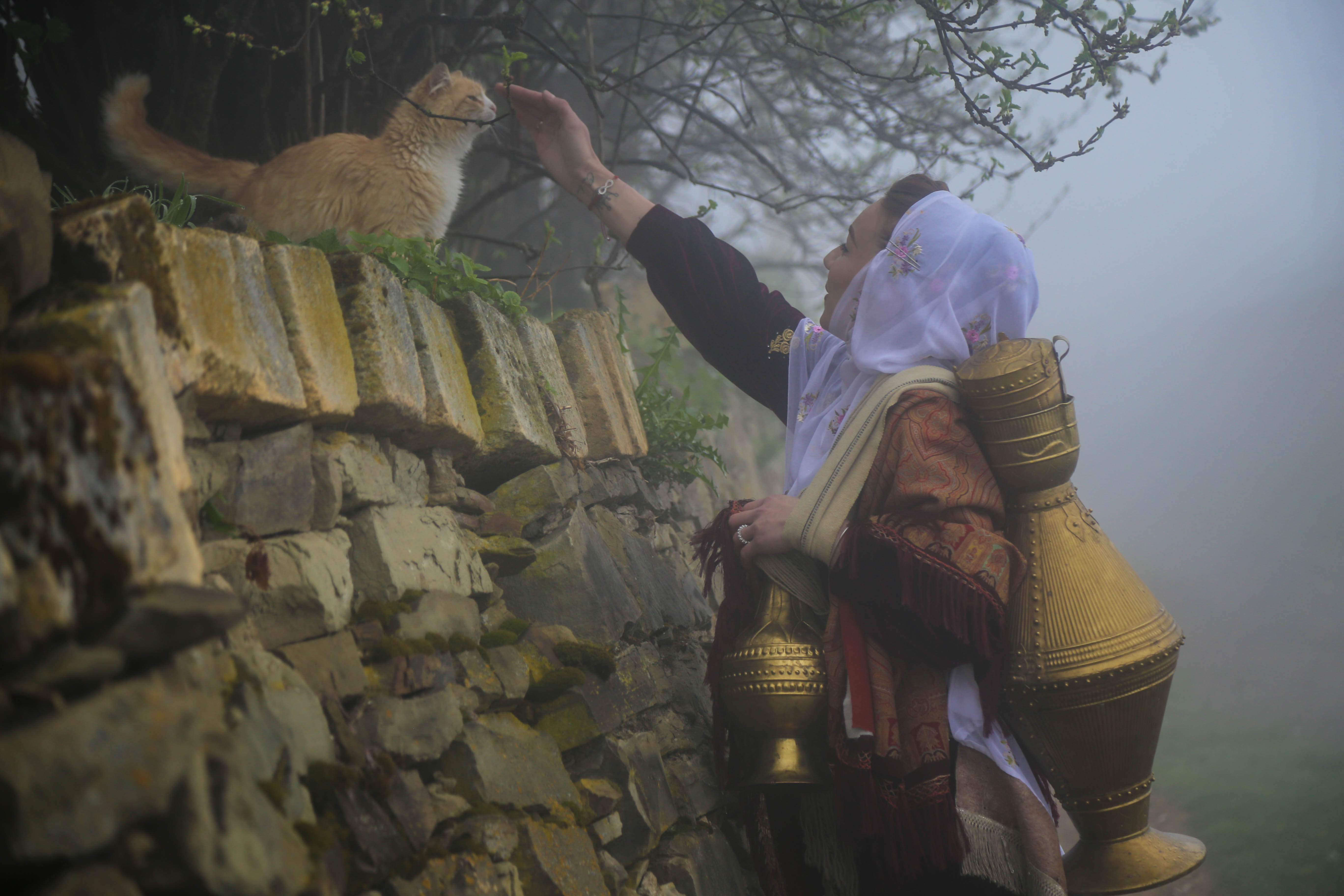 Она немолода, но глаз от нее не оторвать. Голову женщины покрывает каз – длинный белый палантин. Он расшит золотистой ниткой – кубачинский узор. Без помощи надеть его не получится – особый способ. Но Зайнаб, как и все женщины Кубачи, делает это ловко. Их бабушки и прабабушки носили каз всегда. Велюровое платье цвета спелой вишни тоже украшено узором. Ниспадающий сзади платок выглядит празднично. Однако это часть ежедневного наряда кубачинской женщины. Даже старшие девчонки в школе такие носят.