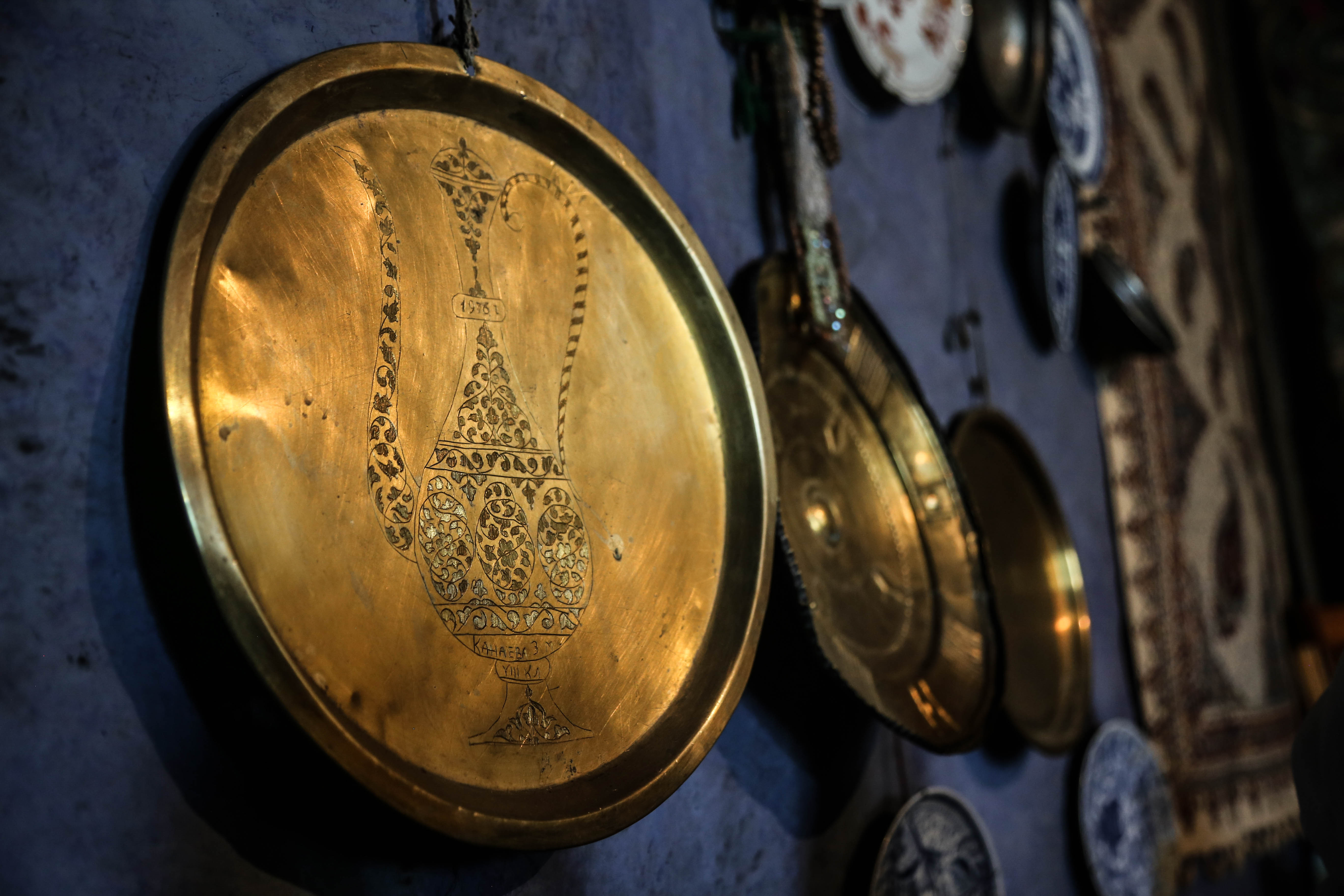 На полках кувшины для воды, старинная утварь. На синей стене отливают медью блюда иранских мастеров V-VII веков – богатство, которому нет цены.