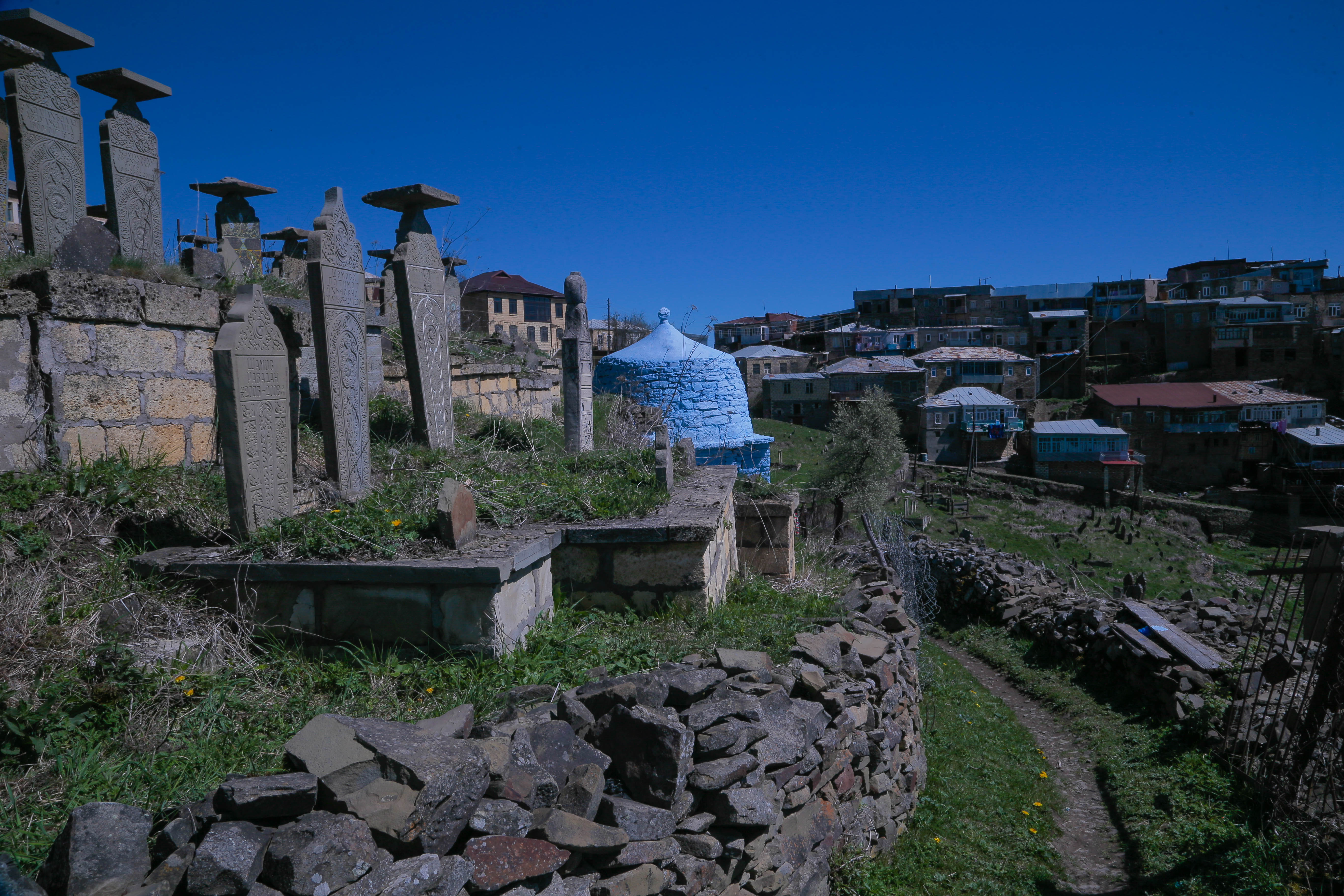 Утром следующего дня идем смотреть Кубачи. Село в этот день залито солнцем. Совсем немного, и мы у кладбища. Их здесь два: верхнее и нижнее. Их делит тропа.