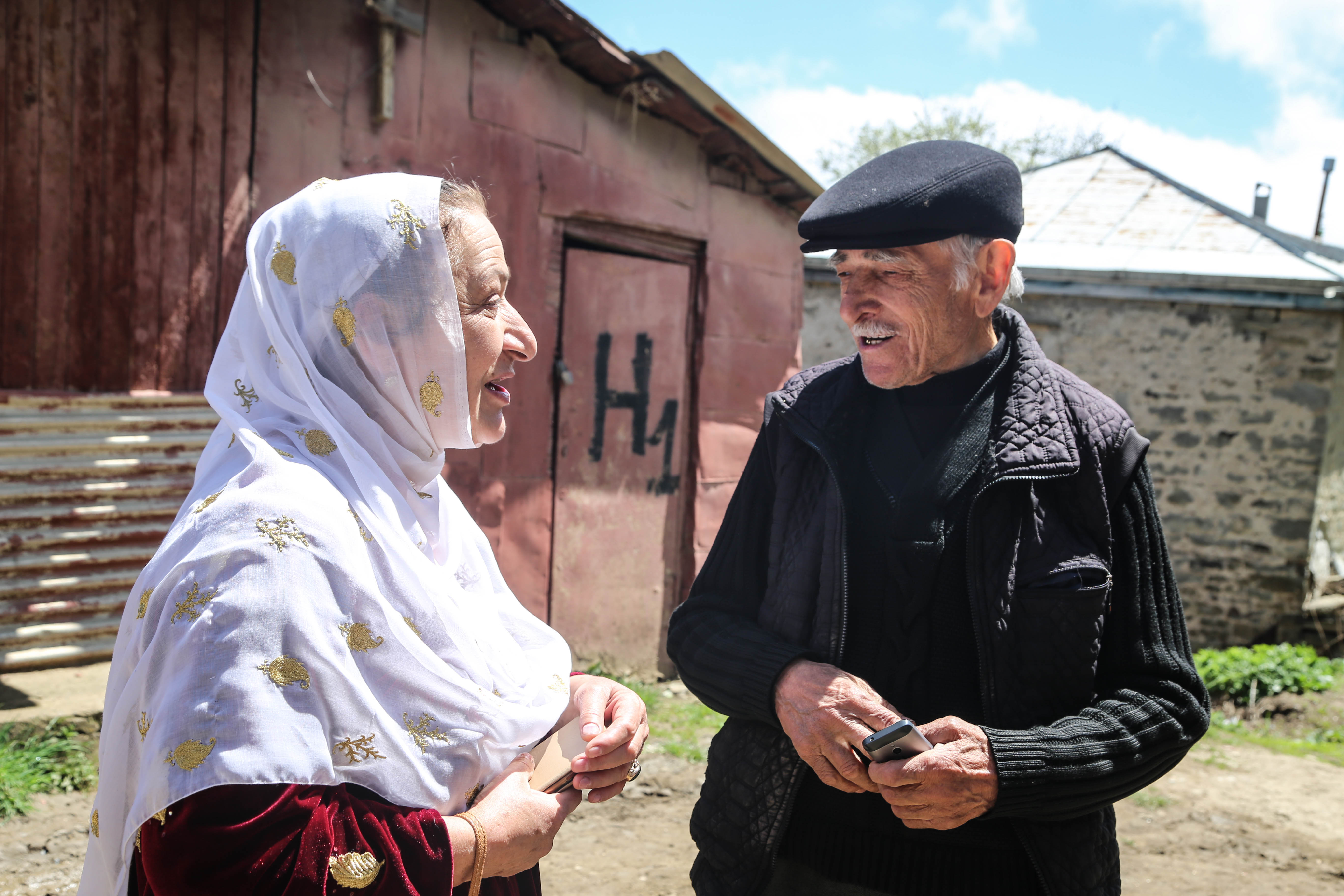 Миновали пару домов, снова остановились – обменяться новостями, узнать, как дела. Старики ремонтируют крышу дома, чинят дверь. Им помогает сосед.