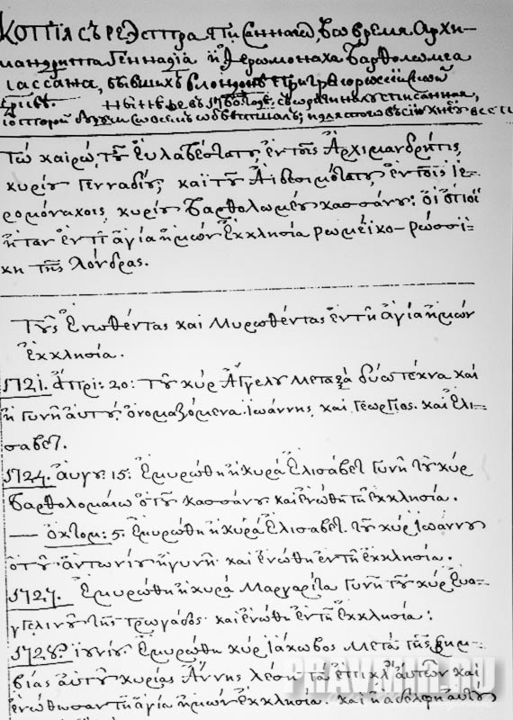 копия метрических записей отцов Геннадия (первого настоятеля посольской церкви) и Варфоломея (его племянника), ведшихся с 1721 года.