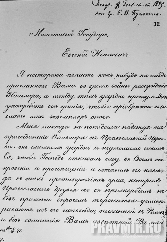 письмо о. Евгению Попову о возможном принятии Православия Уильямом Пальмером (один из представителей т.н. Оксфордского движения в Англиканской церкви. Члены движения выступали за восстановление утраченных традиций христианской веры. Именно они сформулировали классическую «теорию ветвей», которой определяется экуменизм. Пальмер в конечном итоге принял католическую веру).