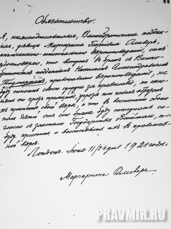 обязательство невесты-англиканки, выходящей замуж за православного англичанина (написано рукой о. Евгения Смирнова): не препятствовать вере мужа, воспитывать детей в православной вере и т.д.
