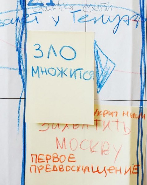 Сначала рисуется раскадровка, на которой примерно понятно, что где стоит и как в этом движутся герои и «камера». (А, надо сказать, камера здесь постоянно движется, при просмотре готовых кусков всё время возникает ощущение съёмок с крана-стрелки).