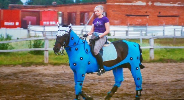 В этом случае экранный герой повторит мимику актёра. Для точного совмещения на лицо актёра нанесены контрольные точки. Камера расположена на шлеме.