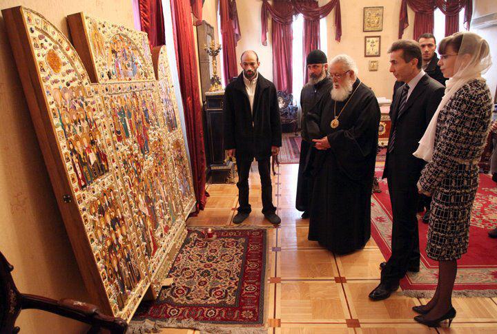 Патриарх Илия II с премьер-министром Грузии Бидзиа Иванишвили и его супругой перед иконой Всех грузинских святых