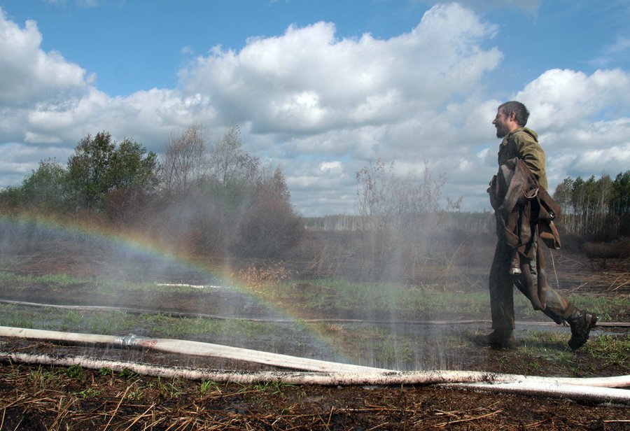 «Я не знаю, что говорить, когда меня спрашивают – а разве что-то еще горит. Людям кажется, что если у них дома нет дыма, значит пожары кончились» сосредоточенно и размеренно говорит Петр Свешников. Он – неформальный хозяин лагеря добровольцев, тушащих торфяник под Рязановским. Московский поэт, автор проекта «Психочтения» и сын протоиерея Владислава Свешникова сначала развозил помощь погорельцам. Приехал на день сюда, работает вот уже 10 дней. Мы привезли к нему пару добровольцев, выгрузили пожарные рукава, стволы, краны, краги: в последние пару месяцев эти слова пополнили лексикон каждой уважающей себя женщины. «Ну, поехали на экскурсию» — сказал «начальник тайги».