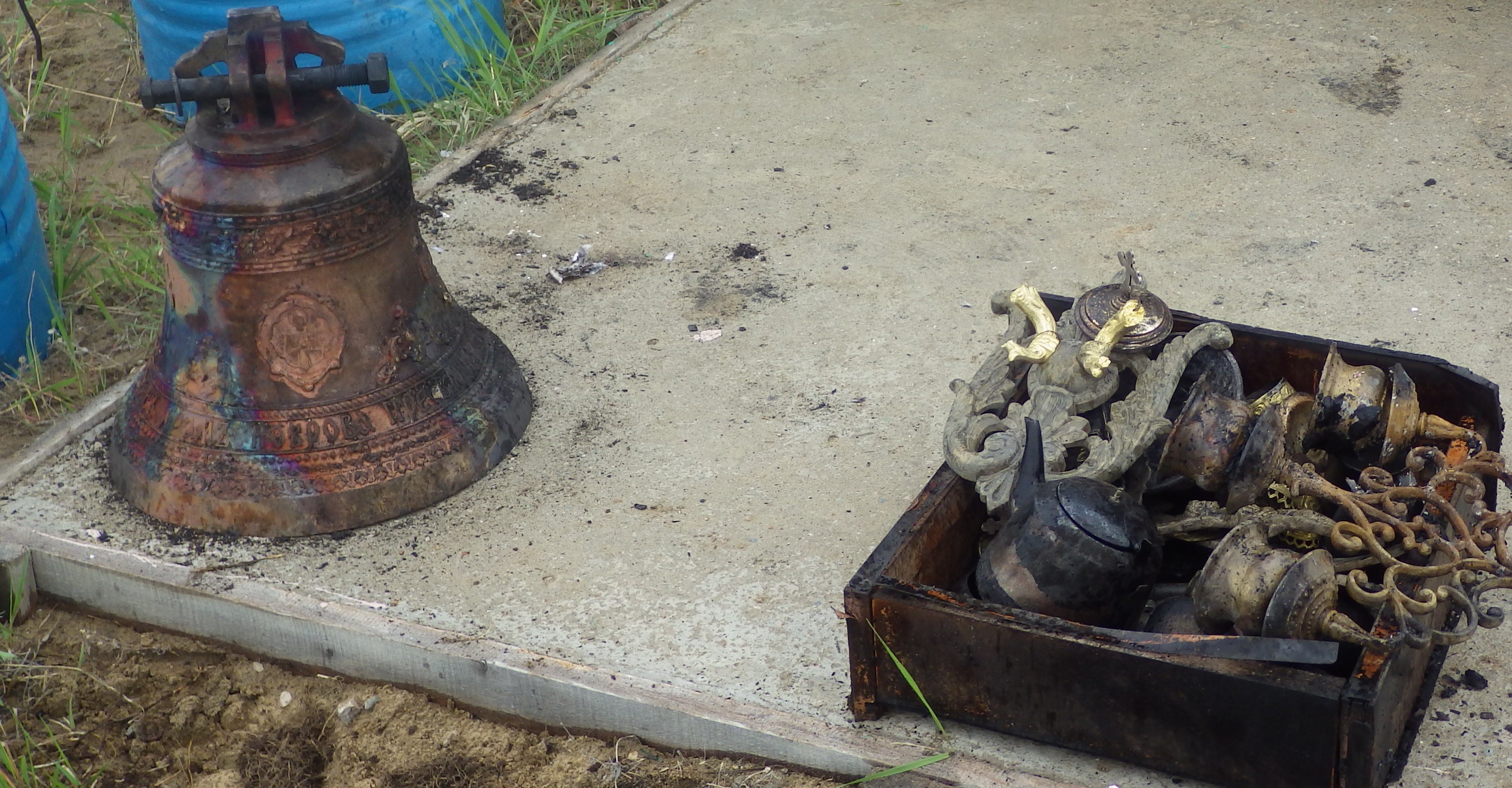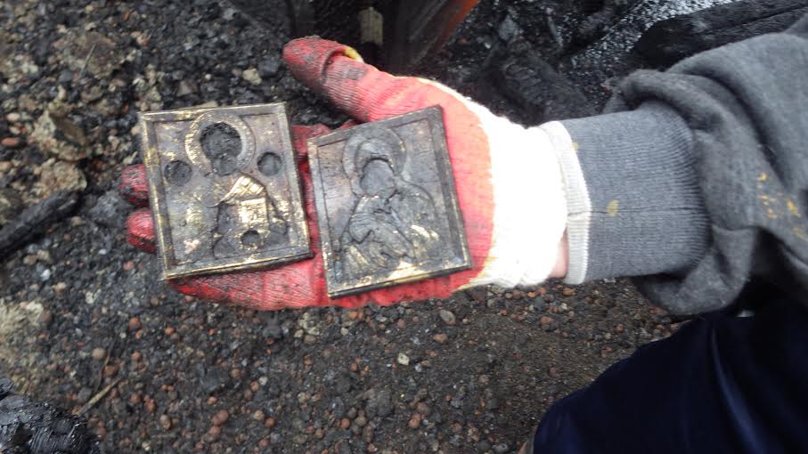 А затем прихожане начали разбирать завалы. Рассказывать тут особенно нечего – сохранилось очень немногое. Колокол и чаша для святой воды больше для использования непригодны. Страшно пустуют металлические оклады от маленьких икон. И вообще на руины некогда светлого и ароматного (вы знаете, как пахнет деревянное строение изнутри?) храма смотреть больно.