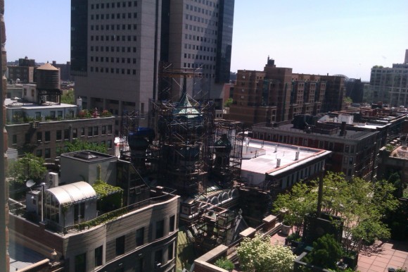 Свято-Николаевский Патриарший собор стоит без крестов… Хотя мало кто из постоянных прихожан и заходящих в русскую церковь наших соотечественников, бывающих в Нью-Йорке наездом, это заметит. Третий месяц собор покрывают строительные леса, и лишь с высоты домов напротив открывается картина ремонта.