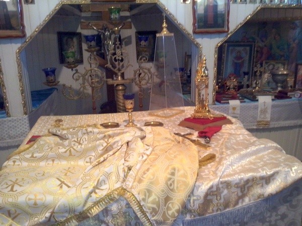 Настоятель благодарит Бога, что грабители не осквернили престол, антиминс и Богослужебные сосуды.