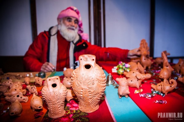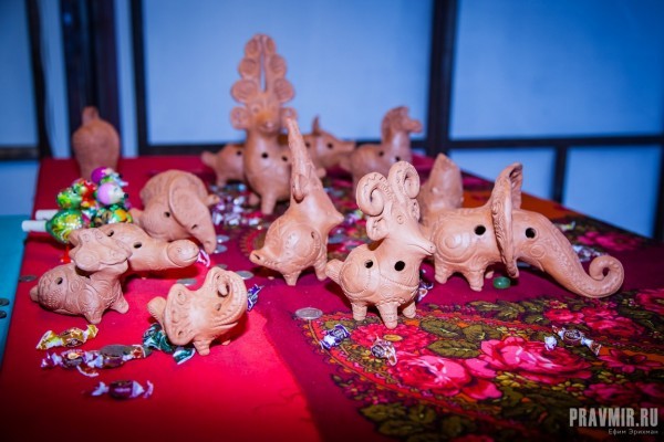 Мастер берет в руки свистульку-филина. Филин «ухает», поет. Берет ежика – оказывается, ежик умеет пыхтеть. Есть многоголосные инструменты, а на некоторых можно играть и петь одновременно.