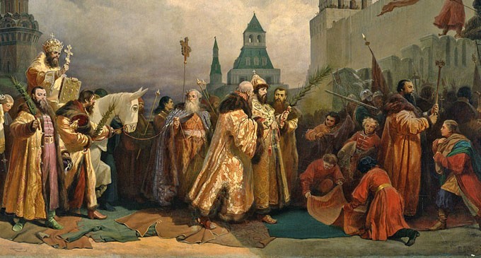 «благочестивейшии Самодержци наши… обычай всесмиренный прияша, еже возседшу Патриарху на жребя, в память въехания Господня во Иерусалим, смирят и высоту свою царьскую и скипетрокрасныма рукама си узде того осляти прикасатися и тако… сослужителствовати Христу Господу: за сие убо дело есть похвално, ибо мнози толиким смирением Царя земнаго пред Царем Небесным умиляются».