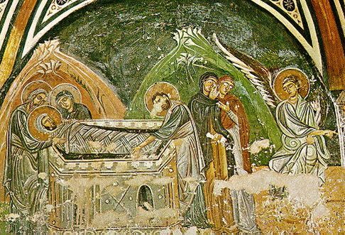 Именно так сцена погребения изображается среди росписей XII века в греческом монастыре Осиос Лукас. А черный фон пещеры Рождества может ассоциироваться с пещерой гробницы, как на иллюстрации к Евангелию XI века с Афона.