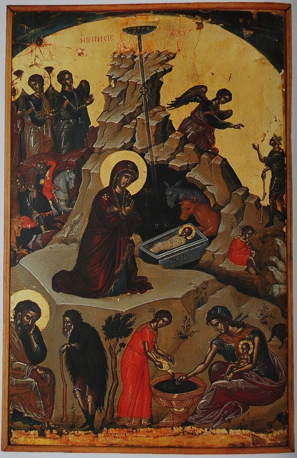 Омовение Христа тоже сюжет не случайный, хотя многие недоумевают, почему столь обыденная сцена, как купание ребенка, имеет место в иконе Рождества. И опять вернемся к апокрифам. Цитируемое выше евангелие псевдо-Матфея и так называемое протоевангелие Иакова рассказывает о двух женщинах-повитухах, которых позвали к готовившейся родить Марии. Согласно апокрифу, первая из них, по имени Зелома, присутствовала при Рождестве и уверовала в то, что Дева смогла родить, но другая – Соломея, засомневалась. Вот как говорится об этом у псевдо-Матфея: «Другая женщина, по имени Саломея, слыша слова Зеломы, сказала: тому, что я слышу, я не поверю, если не удостоверюсь. И Саломея, приблизившись к Марии, сказала Ей: позволь мне прикоснуться к Тебе и удостовериться, что Зелома сказала правду. И когда Мария позволила, Саломея прикоснулась и тотчас же иссохла рука ее и, почувствовав сильную боль, она стала плакать весьма громко и кричать, и сказала: Господи, Ты знаешь, что я всегда боялась Тебя, что я всегда ходила за бедными, не принимая вознаграждения; я ничего не брала от вдов и сирот и никогда не отсылала прочь от себя недужного, не оказав ему помощи. И вот я стала несчастной из-за неверия моего, оттого что осмелилась усомниться в Твоей Деве! И когда она говорила так, прекрасный юноша появился перед нею и сказал ей: приблизься к Младенцу и поклонись Ему, и прикоснись к Нему рукой твоей, и Он исцелит тебя, ибо Он Спаситель мира и всех, кто уповает на Него». Именно момент исцеления неверующей Соломеи от прикосновения к Божественному Младенцу и представляет нам сюжет купания.