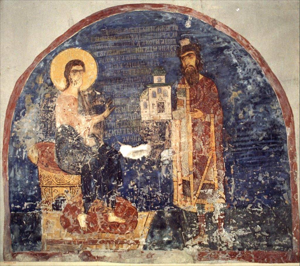 Мало? Будем говорить, что это ничего не доказывает, что шапки могли и в XVI веке нарисовать, а сейчас-то ничего не видно? Хорошо. Возьмём памятник, хоть и не сохранившийся целиком, но фрагменты которого есть и поныне, а целиком эта фреска зафиксирована на фотографиях и копиях начала XX века. Храм Спаса Нередицы в Великом Новгороде, разрушенный в Великую Отечественную и восстановленный после войны. 1198 год. Тоже ктиторская фреска. Тоже князь Ярослав Владимирович (ну, другой – но тоже сильно до монголов). И – внезапно – снова в шапке с меховой опушкой.