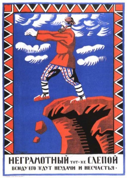 Все помнят плакат: «Неграмотный — тот же слепой». Мы можем там видеть человека, стукающегося головой о небо, но идущего в пропасть. Как мы.
