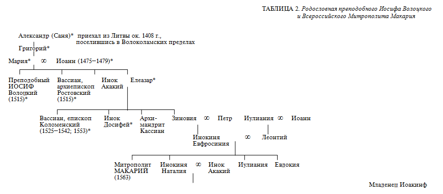 При выяснении степени родства преподобного Иосифа Волоцкого и Митрополита Московского Макария нами были высказаны следующие заключения: “…можно говорить о родственных связях Волоколамского игумена и Всероссийского Митрополита Макария, а связующим звеном в их генеалогии является архимандрит Кассиан. Однако их родственные отношения, заранее можно сказать, были довольно дальними, и сам этот факт остался незафиксированным в истории. Логичнее предположить, что родство шло по материнской линии, то есть Зиновия, бабушка митрополита Макария по материнской линии, была сестрой архимандрита Кассиана и племянницей преподобного Иосифа Волоцкого. Тогда архимандрит Кассиан является внучатым дядей, то есть двоюродным дедом Митрополита Макария, а преподобный Иосиф Волоцкий — брат прадеда Святителя по материнской линии”19 (см. Таблицу 2).