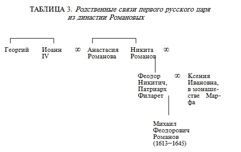 Между династией Даниловичей и династией Романовых в конце XVI, начале XVII века на Московском престоле были два выборных царя, самозванец, а также стремились завладеть им два иностранных претендента — польский королевич Владислав и шведский Филипп. Открывает этот ряд Борис Феодорович Годунов, который был избран в 1598 году на царство после кончины бездетного сына Иоанна Грозного — Феодора Иоанновича. Он был женат на сестре Б. Годунова Ирине Годуновой, а ее брат, Борис, был, таким образом, царским шурином. Первый царь из династии Романовых, Михаил Феодорович Романов, приходился царю Иоанну Грозному, первой женой которого была Анастасия Романова, внучатым племянником23 (см. Таблицу 3).