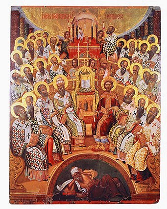 Мы сегодня совершаем с благоговением и благодарностью память Отцов Первого Вселенского Собора, которые перед лицом лжи, поднявшейся на Христа, провозгласили церковную веру о том, что Он – поистине Сын Божий и Бог, равный Отцу и Духу.