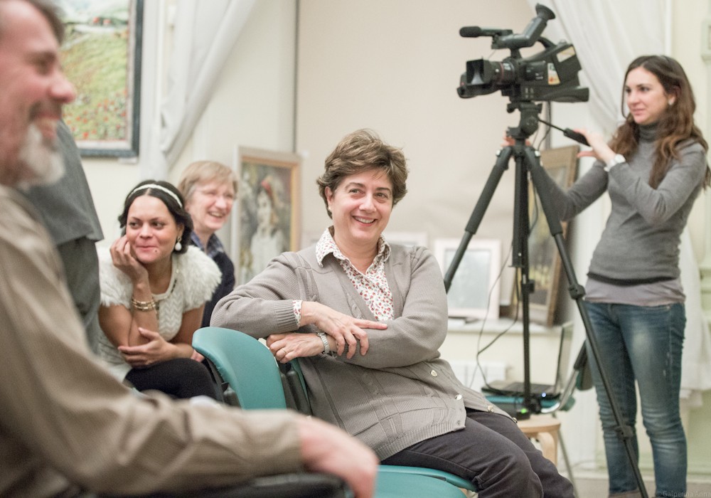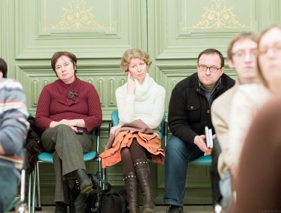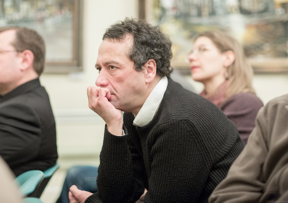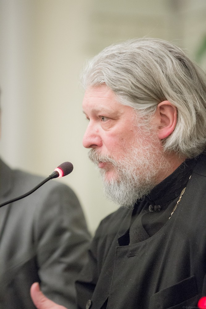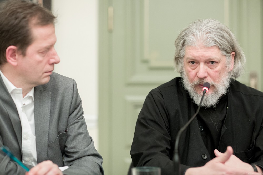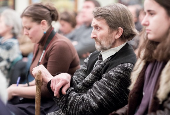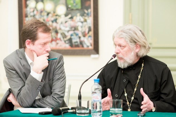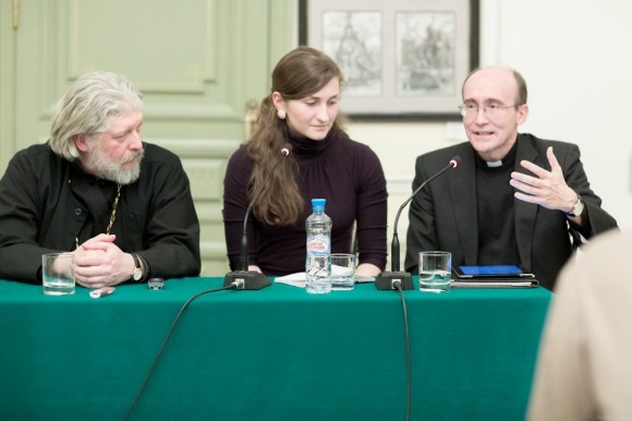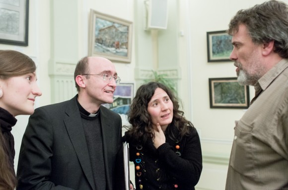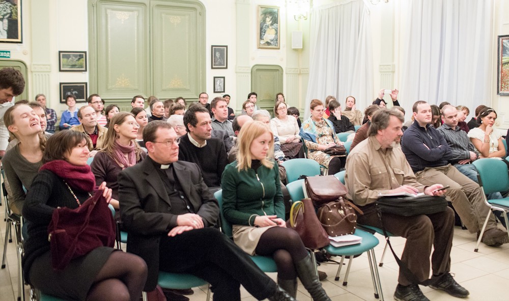 Жан-Франсуа Тири открыл вечер вопросом отцу Хавьеру и отцу Алексию: что значит остаться человеком в кризисе и что нового может предложить христианство человеку в этой ситуации?
