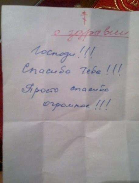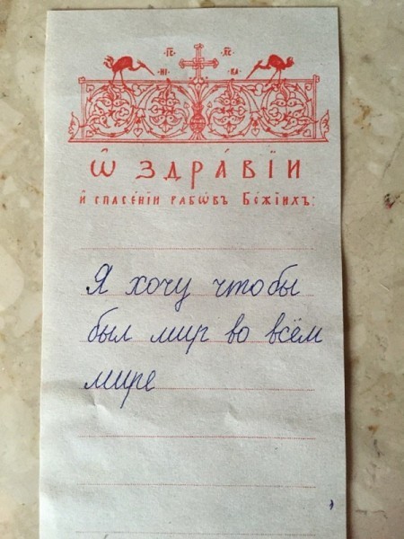 Как же приятно среди врагов и обид видеть искренние детские записки! За всех больных, бедных и за мир во всём мире!